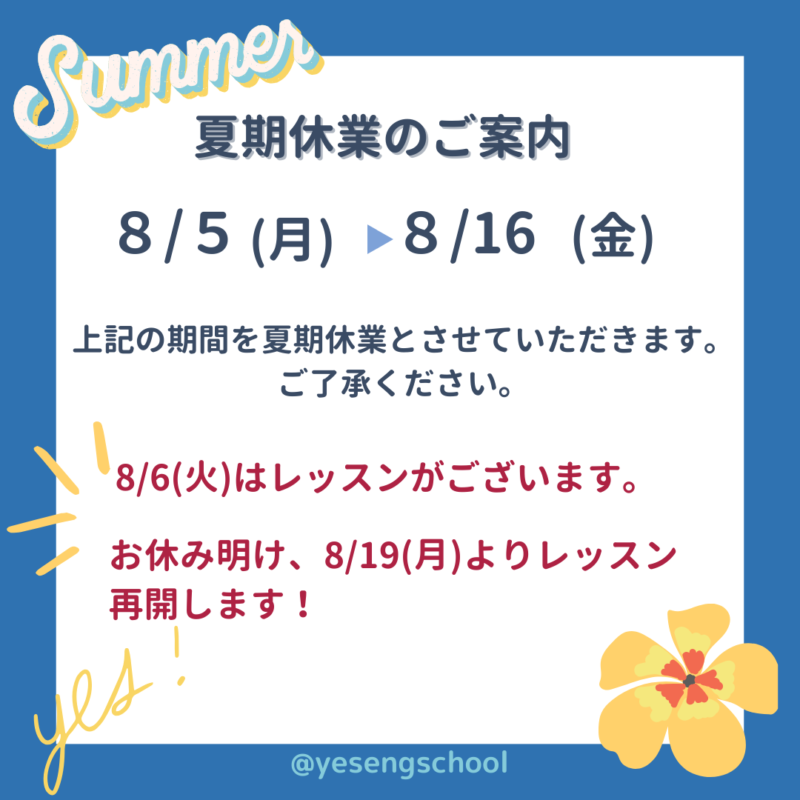 YESは8/5(月)~8/16(金)まで夏休みを頂戴します。