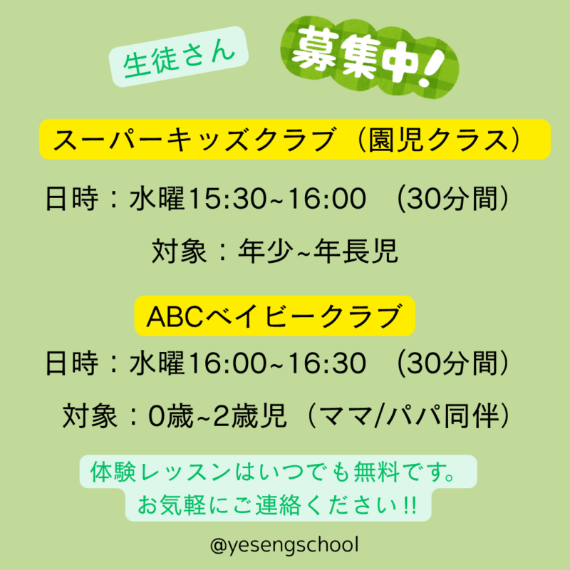 YESでは、次のお子さま向けクラスの生徒さんを随時募集しています。